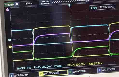 Hình (Phạm vi 1) trong hình, máy hiện sóng hiển thị các tín hiệu bên cao và bên thấp của cổng. Và cũng hiển thị PWM Speed ở 280kHz, tín hiệu vẫn còn hơi chéo, mình sử dụng IRFP4242 MOSFET, MOSFET nặng quá. Để khắc phục điều này, mình giảm tốc độ bằng cách thay thế điện trở R15 (1K xem sơ đồ), bằng cách giảm giá trị của điện trở, tốc độ PWM sẽ giảm xuống. Và nếu giá trị điện trở tăng, tốc độ PWM sẽ tăng. Và cũng thay đổi cổng điện trở R31-R34 thành điện trở 22R 1 / 4W.