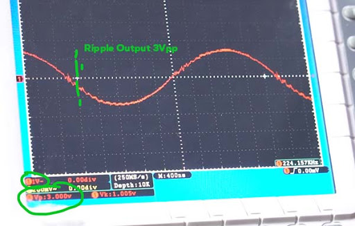 Và đây là Đầu ra Ripple, các âm ly lớp D đầu ra Ripple với cấu trúc liên kết không phải UcD nên ở khoảng 3Vpeak để đạt đỉnh, không vượt quá 4Vpeak để đạt đỉnh. và không nhỏ hơn 500mVpeak đến đỉnh điểm. Điều này ảnh hưởng không nhỏ đến chất lượng và hiệu quả hoạt động của lớp D.Cách đo nó bằng máy hiện sóng. sử dụng Đầu dò GND để + hoặc – Đầu ra, và + Đầu dò mình + hoặc – Đầu ra, cảnh báo nếu bạn đang sử dụng đầu dò không bị cô lập, hãy rút tất cả các kênh của đầu dò GND không phải để đo đầu ra. Cài đặt thời gian / div ở 500nS và Volt / div ở 1V. Những gì được đo không phải là giá trị RMS mà là giá trị điện áp từ Đỉnh đến Đỉnh.