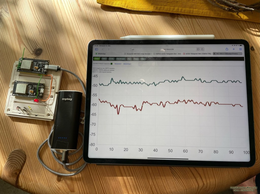 mình đã viết một vài dòng mã ANNEX32 BASIC chạy trên cả hai mô-đun ESP32 và hiển thị cường độ trường WIFI của điểm truy cập WIFI được đo bởi cả hai thiết bị trong cửa sổ Life Browser. Mô-đun 1 (có ăng-ten bổ sung) tự ghi lại giá trị RSSI WIFI của riêng nó và yêu cầu thêm một chuỗi với RSSI đã ghi từ mô-đun thứ hai (chưa sửa đổi). Do đó, cửa sổ trình duyệt này luôn hiển thị hai đường cong trượt, mỗi đường cong có 100 phép đo gần nhất cách nhau khoảng 50 giây.