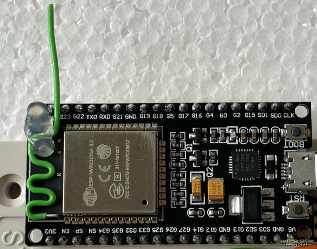 Cuối cùng, để đơn giản nhưng hiệu quả nhất có thể, mình đã thêm một dây ăng-ten bán sóng vào ăng-ten tích hợp ban đầu của mô-đun ESP32.